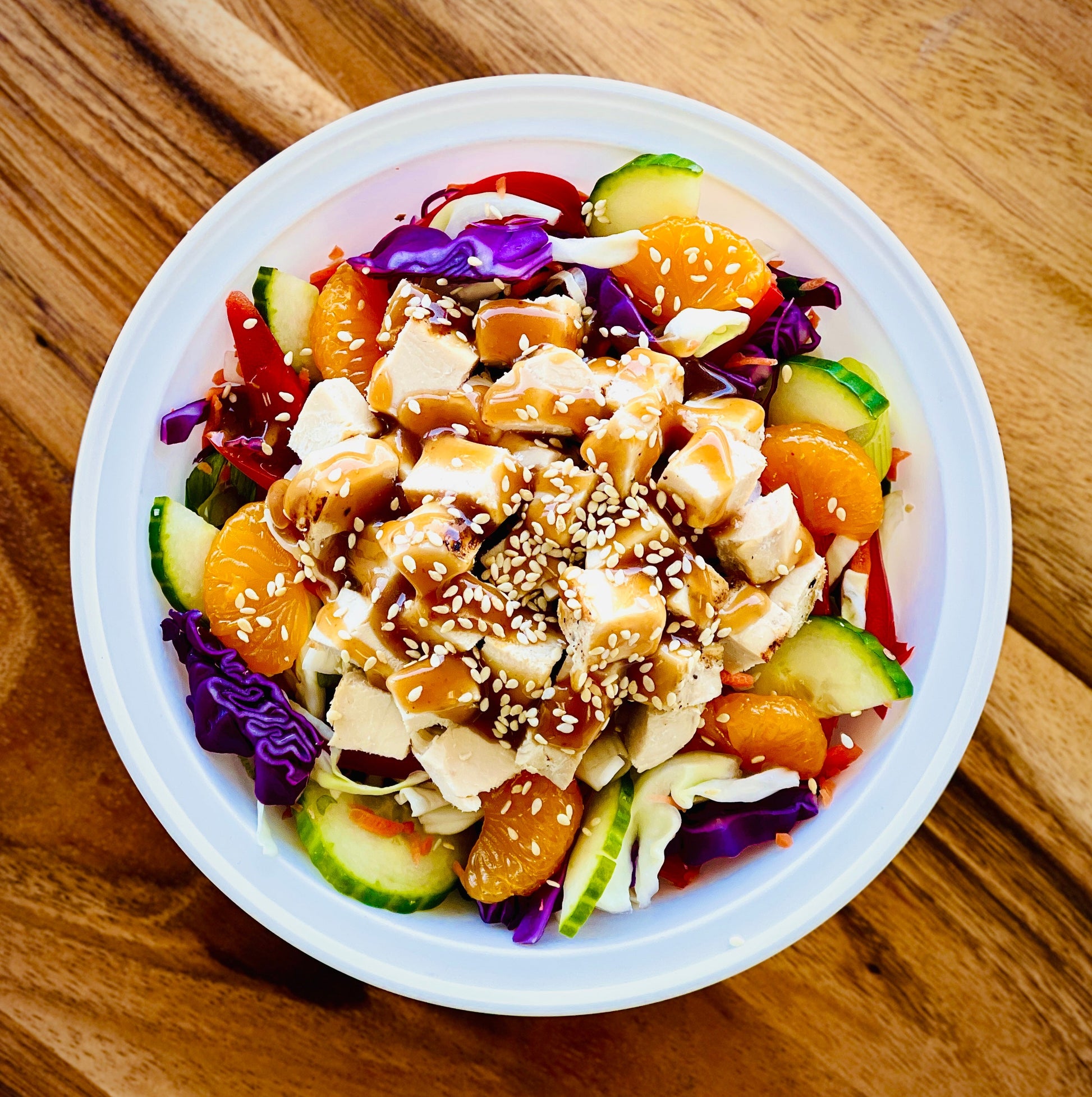 Marinated Chicken- Rice Noodle- Cabbage- Carrot- Cucumber- Scallion- Mandarin Orange- Slivered Almond- Sesame Ginger Dressing